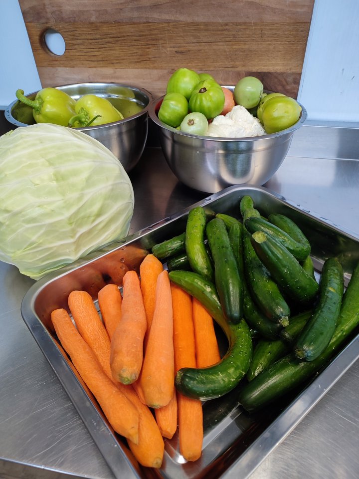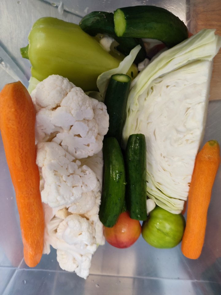 Всички зеленчуци се измиват добре. На чушките дръжките се накъсяват. Карфиолът се накъсва на средно големи рози, морковите се обелват, лютите чушки се надупчват с вилица, а на доматите се прави дълбок разрез на кръст. В случай, че слагате корнишони, изрязвате двете крайчета.